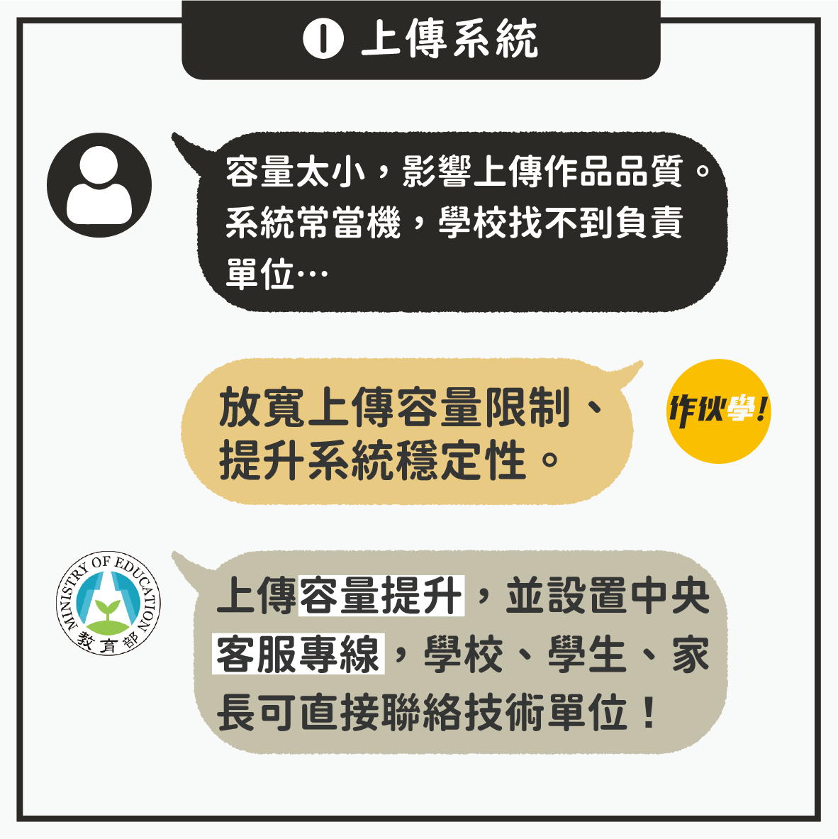 對此,國教署彭富源署長回應,有關學生反應上傳檔案的空間不足,就技術面來說,未來提升容量並沒有問題。至於現有系統服務不足部分,署內已經進行檢討,目前正在架設客服專線,開通後將盡速週知各單位,讓學校、學生能直接反映使用問題給客服人員,儘速聯絡技術單位予以協助。